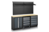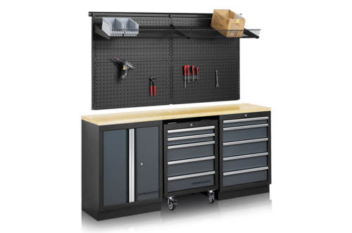 Garageinredning Homeworx Komplett 2 består av två olika underskåp varav ett med skåp och ett med lådor, en bordshurts på hjul, en bänkskiva i träfiber, fyra perforerade paneler och två trådhyllplan. Lådorna i underskåp och hurts har kullagrade expansioner. Bänkskivan är placerad på en ergonomisk höjd på 95 cm.