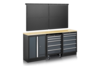 Garageinredning Homeworx Komplett 3 består av två olika underskåp varav ett med skåp och ett med lådor, en bordshurts på hjul, en bänkskiva i träfiber och fyra perforerade paneler. Lådorna i underskåp och hurts har kullagrade expansioner. Bänkskivan är placerad på en ergonomisk höjd på 95 cm.