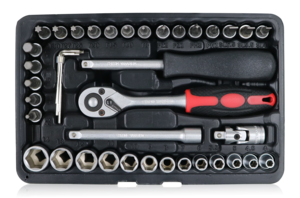 Verktygssats med hylsnycklar och tillbehör som förenklar många moment under arbetet.