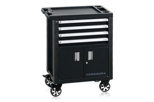 Förvara dina befintliga verktyg och redskap i Verktygsvagn X1-0 från Homeworx. Med smidiga utdragbara lådor och ett underskåp med två dörrar får du gott om förvaringsutrymme för dina handverktyg, batteridrivna verktyg och övrig utrustning. Samtliga lådor har ett inlägg i foam som skapar en behaglig och tyst känsla. Stilsäker design i svart (RAL 9005) som passar perfekt i en verkstad eller ett garage.